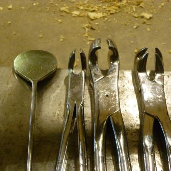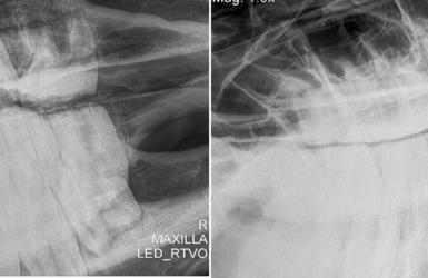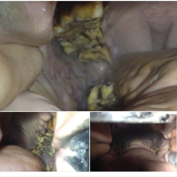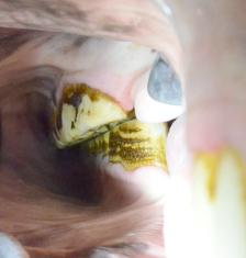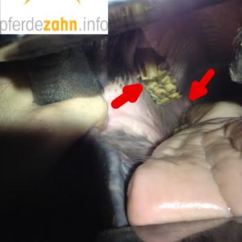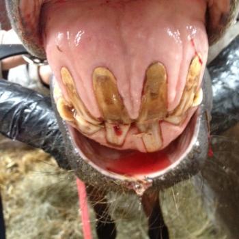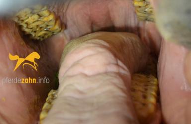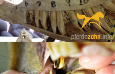 Das vorletzte Bild oben zeigt ein Hauspferd, bei dem ausschließlich scharfe Kanten abgerundet wurden. Es handelt sich dabei um ein extremes Beispiel. Das letzte Bild zeigt den Zustand eines fachgerecht behandelten Pferdegebisses.
