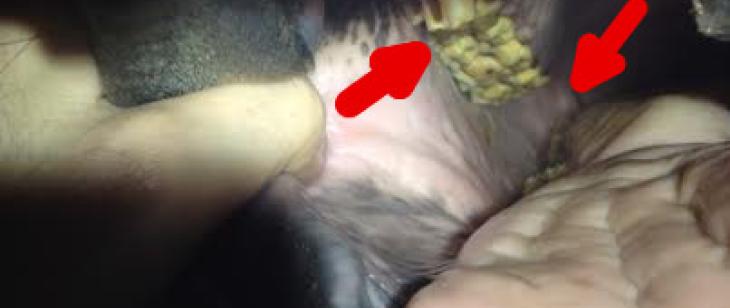 Auf dem Bild sieht man einen Haken am ersten Oberkieferbackenzahn.